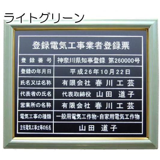 登録電気工事業者登録票 ライトグリーン額入り・板面はブラック /登録電気工事業者登録票 お洒落な 登録電気工事業者登録票 額入 登録電気工事業者登録票