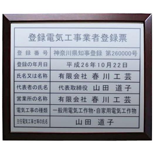 登録電気工事業者登録票は春川工芸で。。額入り・登録電気工事業者登録票 二層式・登録電気工事業者登録票 アクリル製・登録電気工事業者登録票 ステンレス製・登録電気工事業者登録票 etc お値段以上。登録電気工事業者登録票 文字入り 法令標識 法令看板★安い 低価格 格安 激安 安価 安値 制作 製作 作成 作製 販売 法定看板 法定業者票 業者看板 業者プレート 業者票 登録看板 登録プレート 登録サイン 許可看板 許可プレート 標識板 標識看板 標識プレート 標識サイン 表示板 表示プレート 表示看板 表示サイン 掲示板 掲示プレート 掲示看板 掲示サイン 認可プレート 認可票 認可看板 看板プレート サイン看板 事務所用 オフィス用 店舗用 プレート看板 プレート標識 割引価格 卸価格 卸値 値引価格 サイン看板 サインプレート 表札★登録電気工事業者登録票 額入り・登録電気工事業者登録票 二層式・登録電気工事業者登録票。種類豊富。■人気商品■シルバー額・登録電気工事業者登録票 ゴールド額・登録電気工事業者登録票 真鍮製・登録電気工事業者登録票 額入・登録電気工事業者登録票 カラー・登録電気工事業者登録票"}