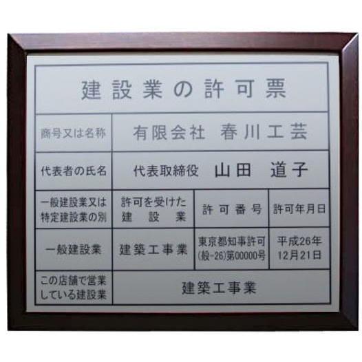 建設業の許可票は春川工芸で。。額入り・建設業の許可票 二層式・建設業の許可票 アクリル製・建設業の許可票 ステンレス製・建設業の許可票 etc 種類豊富。お値段以上。。/建設業許可票 文字入り 法令標識 法令看板★安い 低価格 格安 激安 安価 安値 制作 製作 作成 作製 販売 法定看板 法定業者票 業者看板 業者プレート 業者票 登録看板 登録プレート 登録サイン 許可看板 許可プレート 標識板 標識看板 標識プレート 標識サイン 表示板 表示プレート 表示看板 表示サイン 掲示板 掲示プレート 掲示看板 掲示サイン 認可プレート 認可票 認可看板 看板プレート サイン看板 事務所用 オフィス用 店舗用 プレート看板 プレート標識 割引価格 卸価格 卸値 値引価格 サイン看板 サインプレート 表札 標札★建設業の許可票 額入り・建設業の許可票 二層式・建設業の許可票 アクリル製・建設業の許可票 ステンレス製・建設業の許可票 etc 種類豊富。お値段以上。/建設業許可票■人気商品■シルバー額・建設業の許可票 ゴールド額・建設業の許可票 真鍮製・建設業の許可票 ステンレス製・建設業の許可票 カラー・建設業の許可票"}