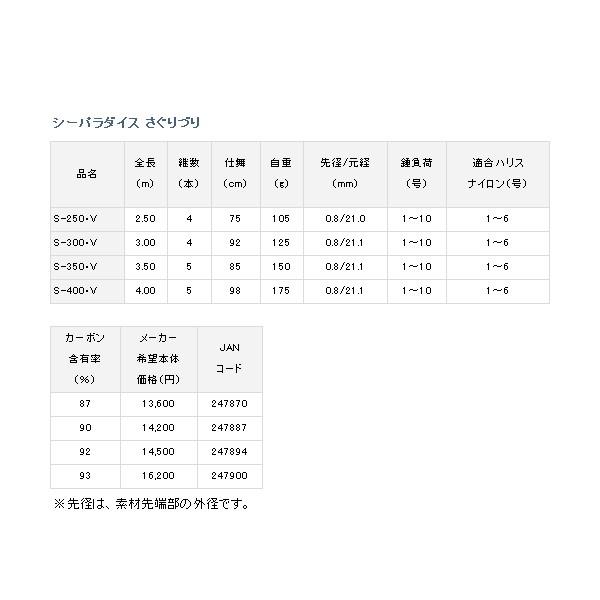 ◆X45で大物が掛かった際もパワフルなやり取りが可能。元竿の設計を前作よりややマイルドにチューンしたことで全体がしなやかに曲がり、「ハリス切れ・口切れ」を軽減。S-250・Vは際ぎりぎりを攻めるのに適したショートモデル。取り回しの良さと優れた目・手感度で沖の魚が反応しない時に頼りになる。S-300・Vは際からやや沖目までを狙うのに適したモデル。操作性の良さと沖から中間のあたりを回遊しているターゲットに有効。S-350・Vはスタンダードなレングスを採用したオールラウンダーモデル。際から沖まで幅広く対応し、あらゆる状況に対応した釣りを展開できるさぐりづり入門にオススメ。S-400・Vは遠くのポイントを狙い打てるロングモデル。沖に魚が出ているがウキ釣りでは魚が口を使わない際に効果的に長さを生かしスローにエサを見せることができる。付属品竿袋《お取り寄せ》商品に関しまして、お待ち頂ける方は予約受付致します/ご連絡下さい。