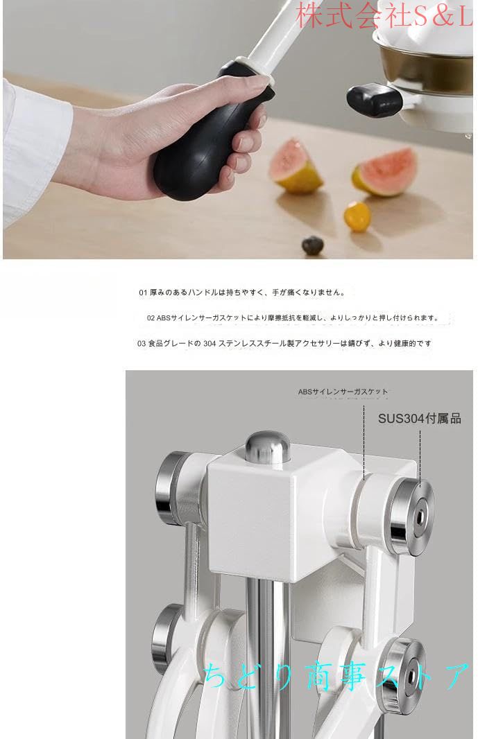 1、手動ジューサー、食品と接触する部分はすべて304ステンレス鋼で、構造がしっかりしていて、耐腐食。大口経ジュース出口設計で、ジュースの流出が速くなる。U型ベース、使用時により安定していて、滑り防止。2.厚みのあるベース + 底部の大きな吸盤 硬質で押してもブレない3.サイレント処理 ABSガスケット・抵抗ノイズを低減4.回転重力レバー 飽きずに絞り続ける5.タコの吸盤は山のように安定している 模造タコ吸盤のデザイン、揺れることなく安定した吸着、動かずに1秒間の吸着、気圧の差を利用して吸着面をしっかりとロックし、プレスがより安定します。