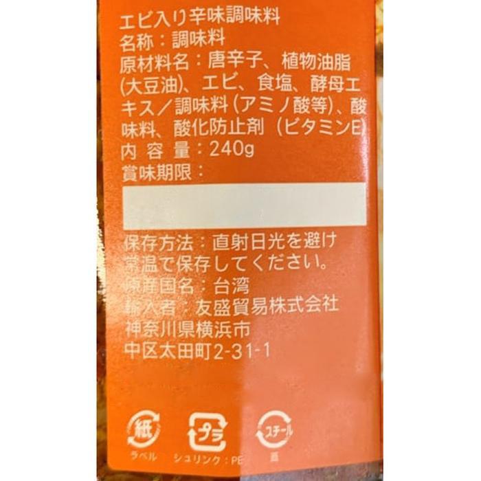 老騾子牌朝天系列蝦米朝天辣椒(えび入り激辛調味料) (台湾産) 240g×24本 210217 唐辛子をベースに桜えびを加えた激辛調味料です。炒め物や麺類、タレ類の辛味調味料として使用します。 生産国:台湾 賞味期間:730日 唐辛子をベースの激辛調味料! キーワード【食品 調味料 料理の素 油 中華 エスニック調味料】