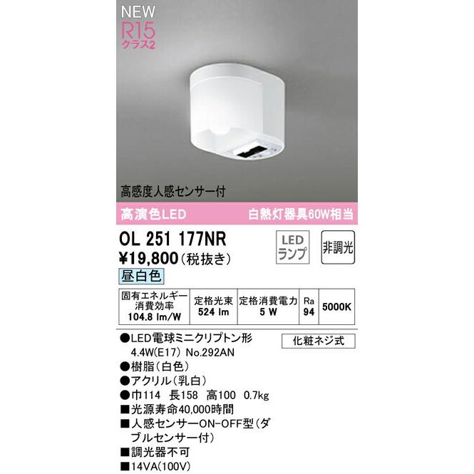 【決済・後払い決済】 高演色LED 白熱灯器具60W相当 OL251177NR 昼白色 消費電力5W Ra94 ●LED電球ミニクリプトン形 4.4W(E17) No.292AN ●脂(白色)●アクリル(乳白) ●巾114 長158 高100 0.7kg ■光源寿命40,000時間 ■人感センサーON-OFF型(ダブルセンサー付) ■調光器 化粧ネジ式 その他メーカーへのお問い合わせはコチラ →