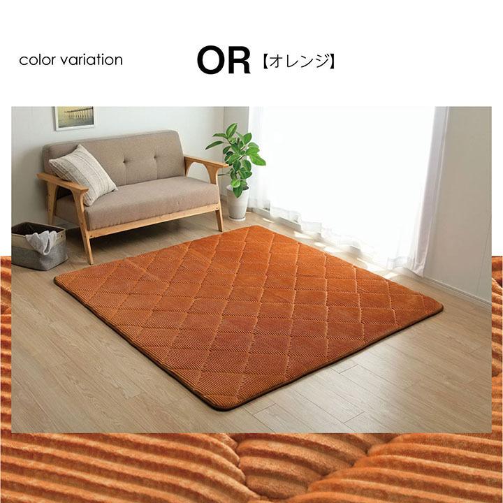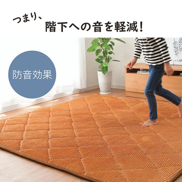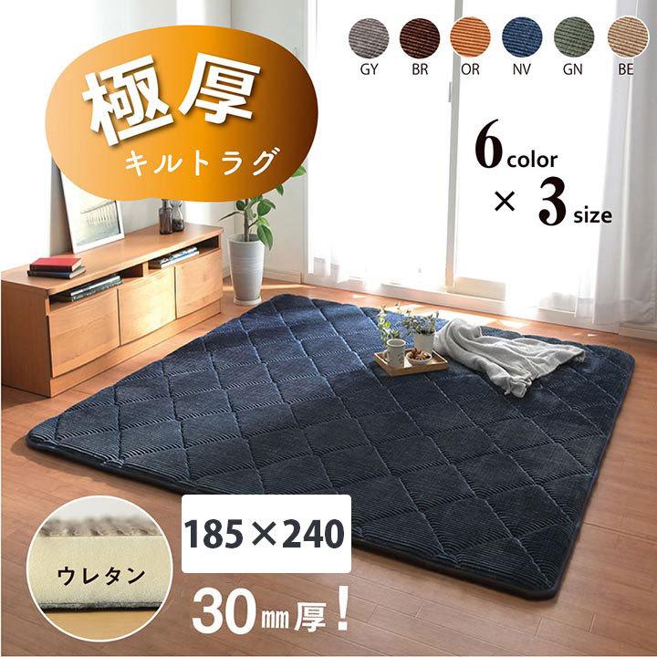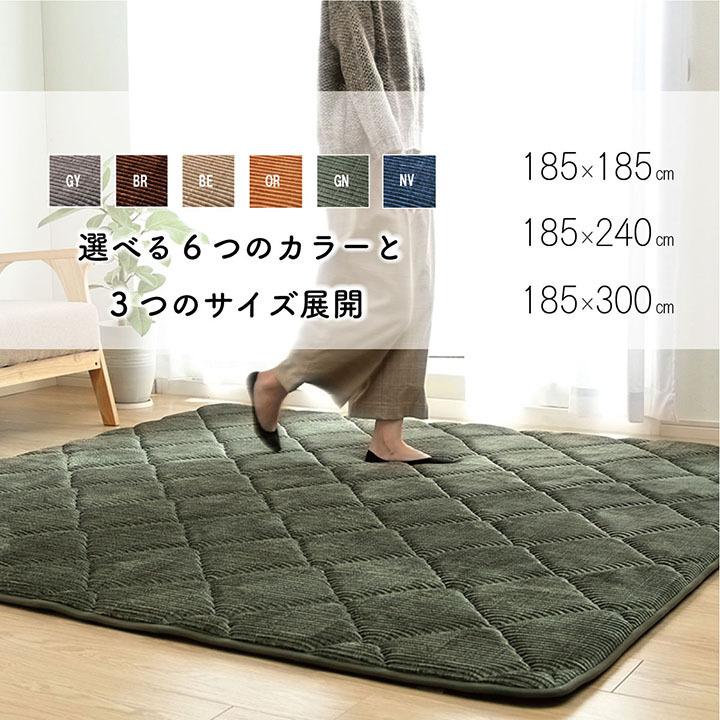 ■こちらのページは【185×240cm】サイズとなります。表地にコーデュロイ調の凹凸にダイヤのキルティングを施しました。落ち着いたカラーと,やわらかな手触りが特徴です。中材に30mmのウレタンフォームを使用したボリュームタイプです。へたりにくく,クッション性と弾力性があるため,フローリングでくつろぎたい方におすすめです。また,ボリュームがあるので,下階に音が響きにくい防音効果があります。裏面にはフローリングの上でも安心してご使用できるよう,滑りにくい加工を施しています。ホットカーペットにも対応しており,こたつ敷布団としてもご使用いただけます。※ 掲載写真は表記サイズと異なる場合がございます。※ 画面上のカラーはご使用ブラウザやモニターの設定により、実物とは若干異なる場合がございます。あらかじめご了承の上、ご注文をお願いいたします。"}