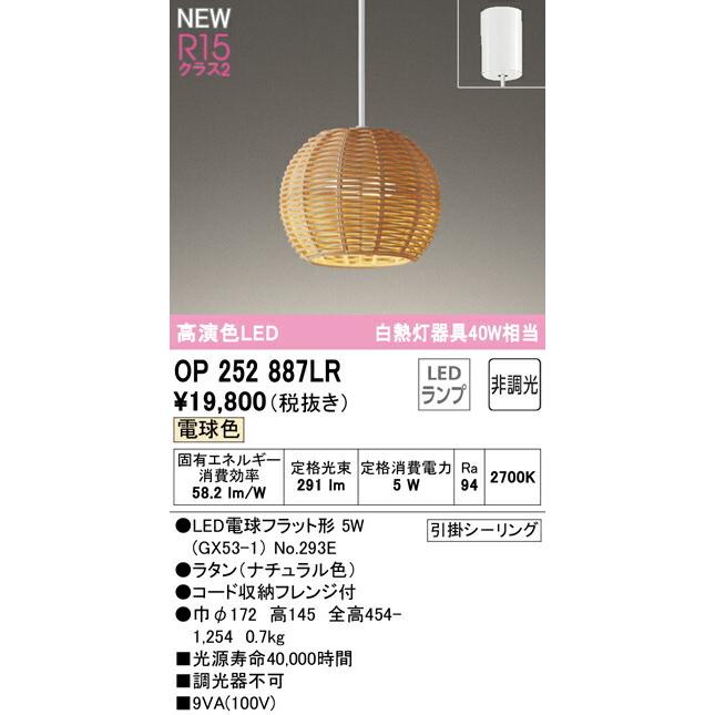 【決済・後払い決済】 高演色LED 白熱灯器具40W相当 OP252887LR 電球色 消費電力5W Ra94 ●LED電球フラット形 5W(GX53-1) No.293E ●タン(ナチュラル色) ●コード収納フレンジ付 ●巾φ172 高145 全高454-1,254 0.7kg ■光源寿命40,000時間 ■調光器 引掛シ-リング その他メーカーへのお問い合わせはコチラ →