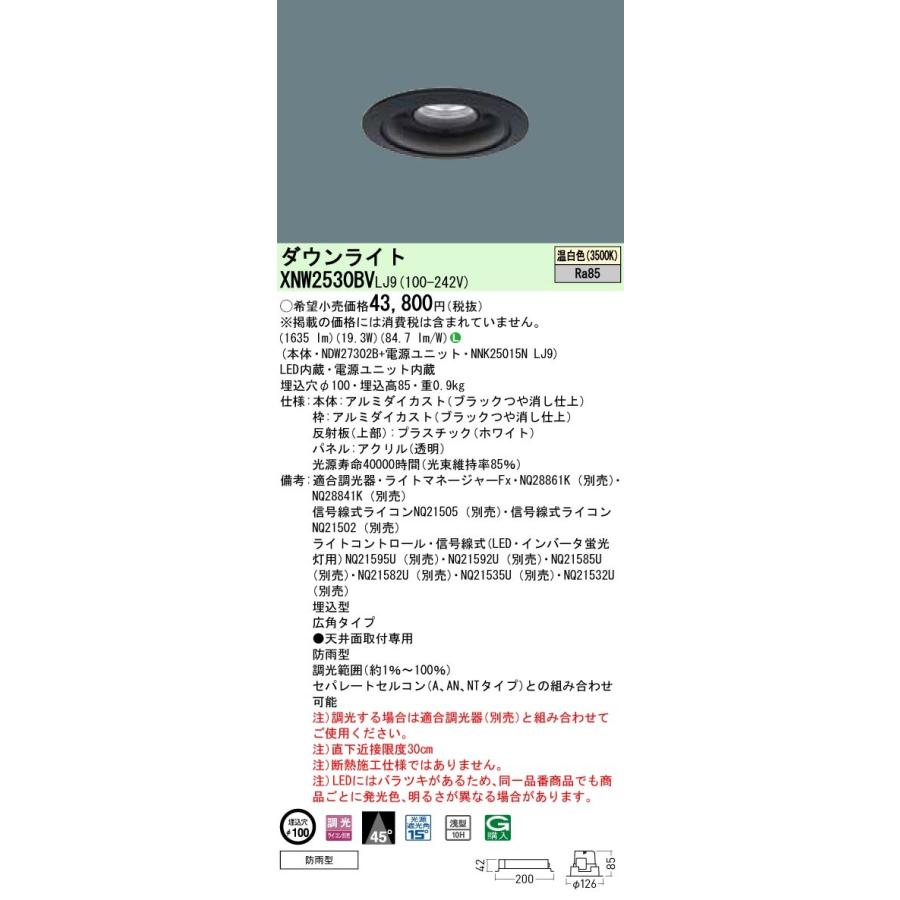 XNW2530BV LJ9 軒下用ダウンライトLED内蔵、電源ユニット内蔵【本体】NDW27302B【電源ユニット】NNK25015N LJ9光源◆LED(温白色) ◆色温度:3500 K ◆光源寿命40000時間(光束維持率85%)寸法・質量◆埋込穴径:φ100 mm ◆埋込高:85 mm◆質量:0.9 kg仕様◆器具光束:1635 lm ◆電圧:100〜242 V ◆消費電力:19.3 W ◆消費効率:84.7 lm/W◆【本体】アルミダイカスト(ブラックつや消し仕上)◆【枠】アルミダイカスト(ブラックつや消し仕上)◆【反射板(上部)】プラスチック(ホワイト)◆【パネル】アクリル(透明)◆Ra85◆埋込型◆広角タイプ 光源遮光角15度◆●天井面取付専用◆防雨型◆調光範囲(約1%〜100%)◆セパレートセルコン(A、AN、NTタイプ)との組み合わせ可能◆調光する場合は適合調光器(別売)と組み合わせてご使用ください。◆直下近接限度30cm◆断熱施工仕様ではありません。