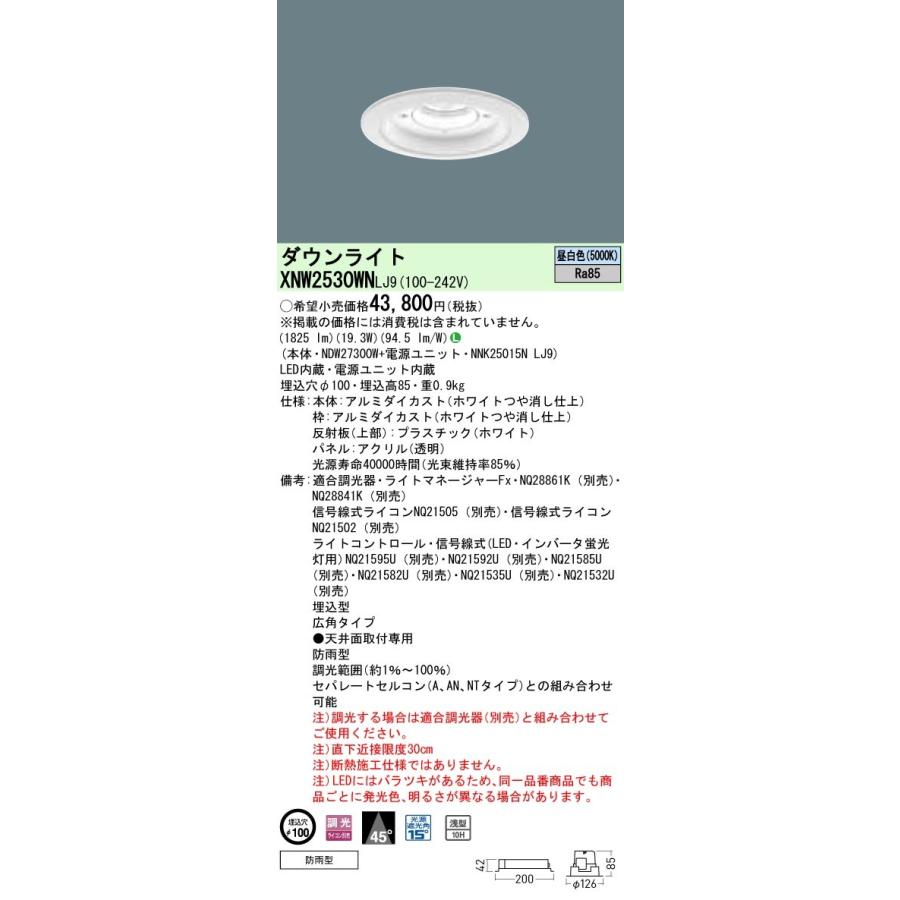 パナソニック XNW2530WN LJ9 LED 昼白色 ダウンライト 浅型10H ビーム角45度 防雨型 調光型 埋込穴φ100 水銀灯100形1灯相当 本体+電源ユニット