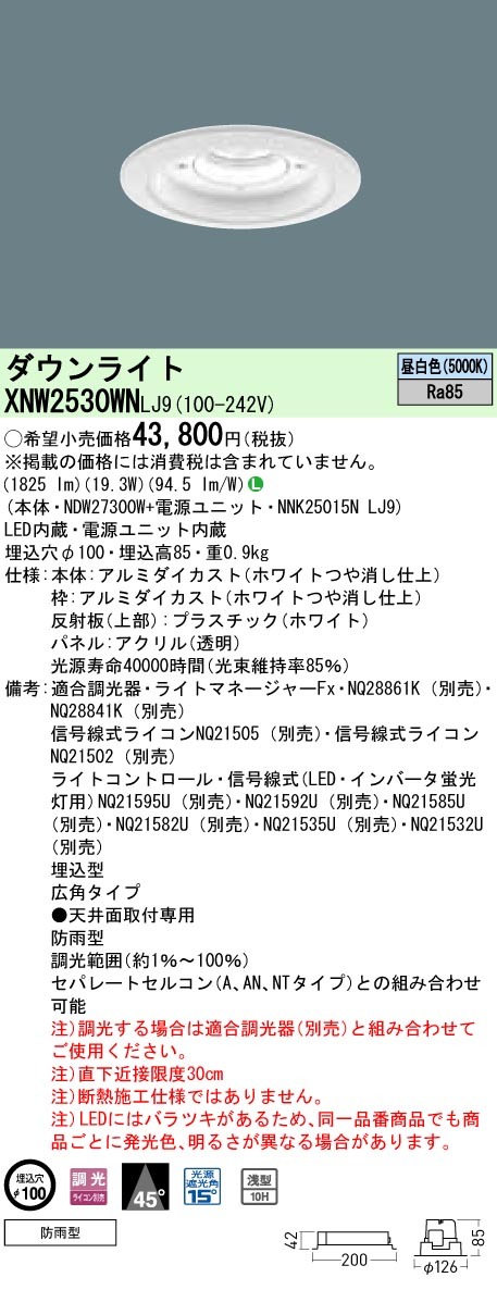 XNW2530WN LJ9 軒下用ダウンライトLED内蔵、電源ユニット内蔵【本体】NDW27300W【電源ユニット】NNK25015N LJ9光源◆LED(昼白色) ◆色温度:5000 K ◆光源寿命40000時間(光束維持率85%)寸法・質量◆埋込穴径:φ100 mm ◆埋込高:85 mm◆質量:0.9 kg仕様◆器具光束:1825 lm ◆電圧:100〜242 V ◆消費電力:19.3 W ◆消費効率:94.5 lm/W◆【本体】アルミダイカスト(ホワイトつや消し仕上)◆【枠】アルミダイカスト(ホワイトつや消し仕上)◆【反射板(上部)】プラスチック(ホワイト)◆【パネル】アクリル(透明)◆Ra85◆埋込型◆広角タイプ 光源遮光角15度◆●天井面取付専用◆防雨型◆調光範囲(約1%〜100%)◆セパレートセルコン(A、AN、NTタイプ)との組み合わせ可能◆調光する場合は適合調光器(別売)と組み合わせてご使用ください。◆直下近接限度30cm◆断熱施工仕様ではありません。
