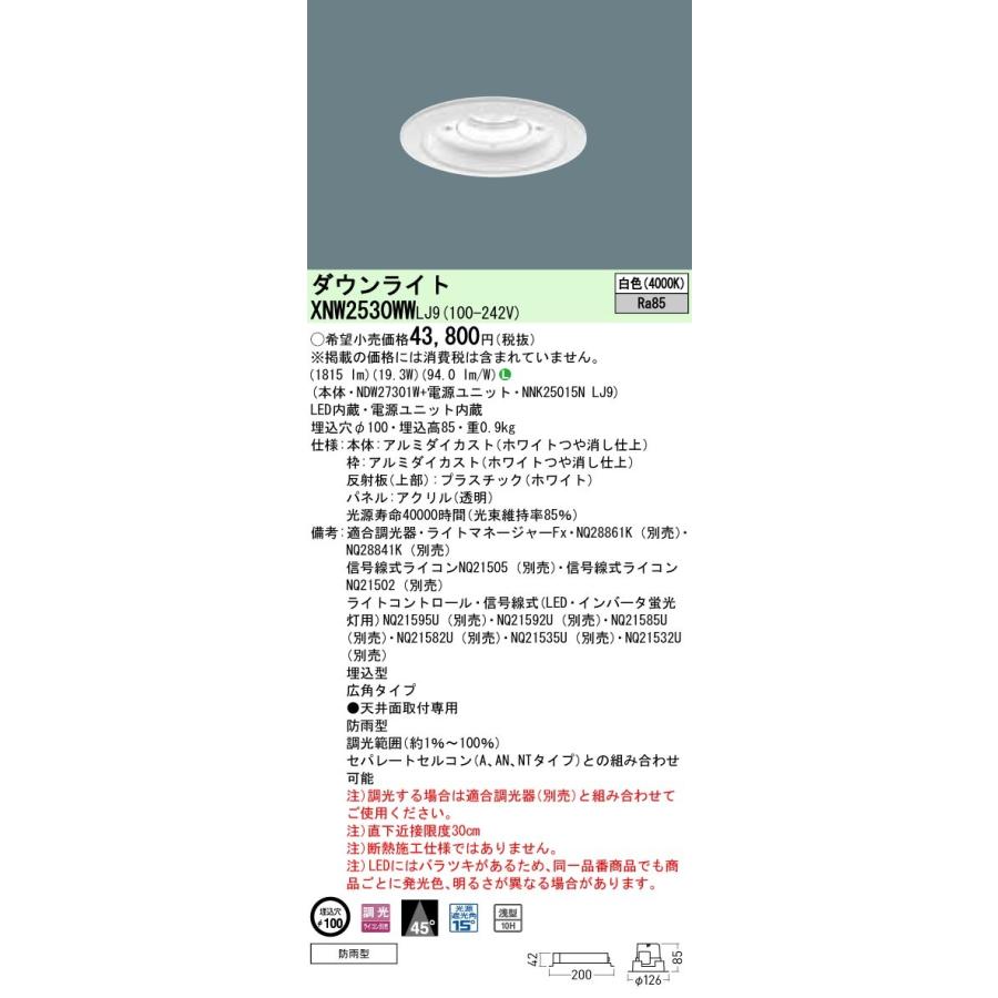 パナソニック XNW2530WW LJ9 LED 白色 ダウンライト 浅型10H ビーム角45度 防雨型 調光型 埋込穴φ100 水銀灯100形1灯相当 本体+電源ユニット