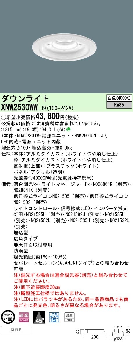 XNW2530WW LJ9 軒下用ダウンライトLED内蔵、電源ユニット内蔵【本体】NDW27301W【電源ユニット】NNK25015N LJ9光源◆LED(白色) ◆色温度:4000 K ◆光源寿命40000時間(光束維持率85%)寸法・質量◆埋込穴径:φ100 mm ◆埋込高:85 mm◆質量:0.9 kg仕様◆器具光束:1815 lm ◆電圧:100〜242 V ◆消費電力:19.3 W ◆消費効率:94 lm/W◆【本体】アルミダイカスト(ホワイトつや消し仕上)◆【枠】アルミダイカスト(ホワイトつや消し仕上)◆【反射板(上部)】プラスチック(ホワイト)◆【パネル】アクリル(透明)◆Ra85◆埋込型◆広角タイプ 光源遮光角15度◆●天井面取付専用◆防雨型◆調光範囲(約1%〜100%)◆セパレートセルコン(A、AN、NTタイプ)との組み合わせ可能◆調光する場合は適合調光器(別売)と組み合わせてご使用ください。◆直下近接限度30cm◆断熱施工仕様ではありません。