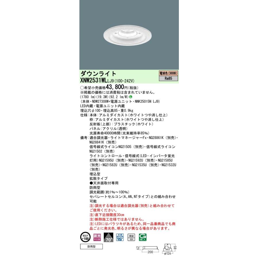 XNW2531WL LJ9 軒下用ダウンライトLED内蔵、電源ユニット内蔵【本体】NDW27308W【電源ユニット】NNK25015N LJ9光源◆LED(電球色) ◆色温度:3000 K ◆光源寿命40000時間(光束維持率85%)寸法・質量◆埋込穴径:φ100 mm ◆埋込高:85 mm◆質量:0.9 kg仕様◆器具光束:1780 lm ◆電圧:100〜242 V ◆消費電力:19.3 W ◆消費効率:92.2 lm/W◆【本体】アルミダイカスト(ホワイトつや消し仕上)◆【枠】アルミダイカスト(ホワイトつや消し仕上)◆【反射板(上部)】プラスチック(ホワイト)◆【パネル】アクリル(透明)◆Ra85◆埋込型◆拡散タイプ 光源遮光角15度◆●天井面取付専用◆防雨型◆調光範囲(約1%〜100%)◆セパレートセルコン(A、AN、NTタイプ)との組み合わせ可能◆調光する場合は適合調光器(別売)と組み合わせてご使用ください。◆直下近接限度30cm◆断熱施工仕様ではありません。