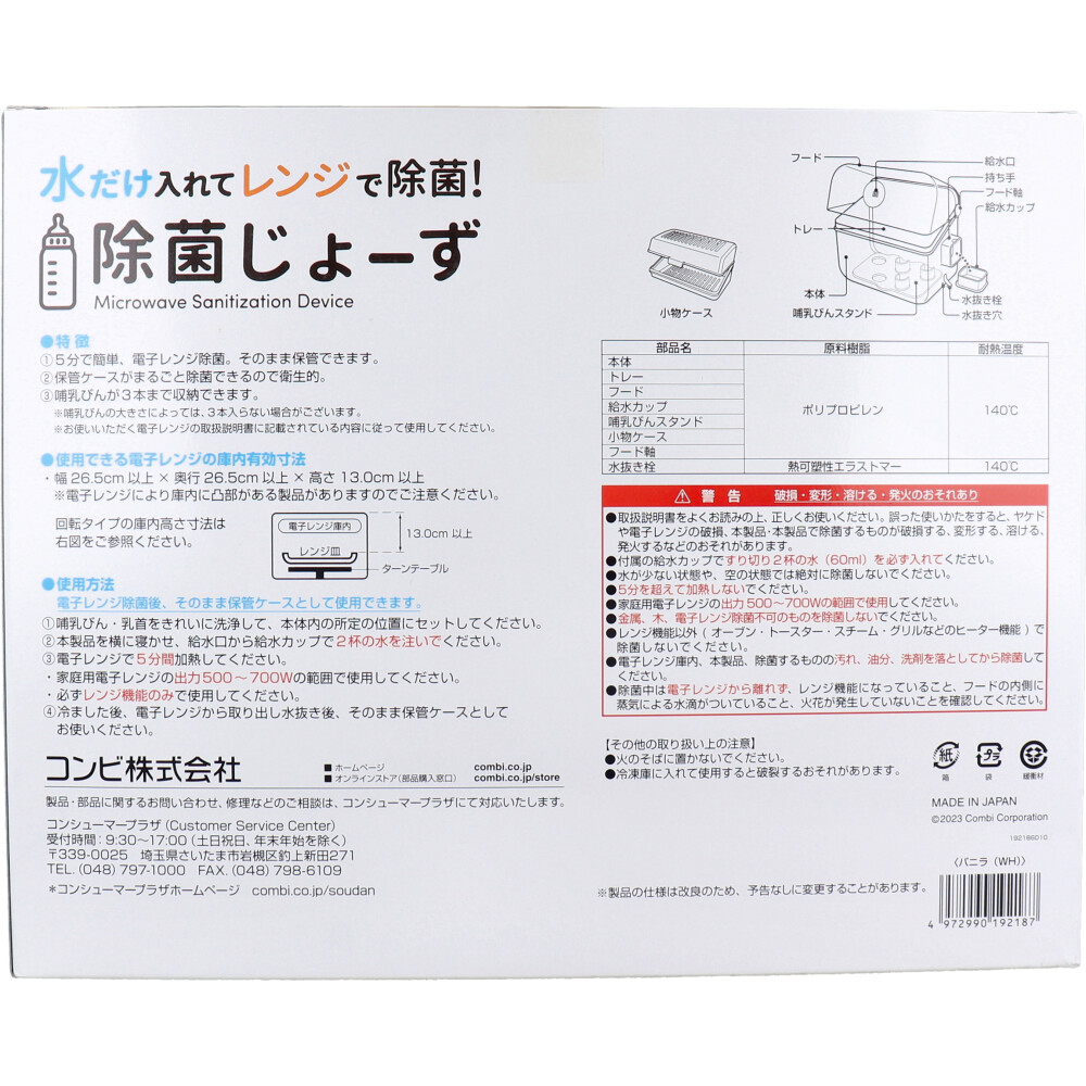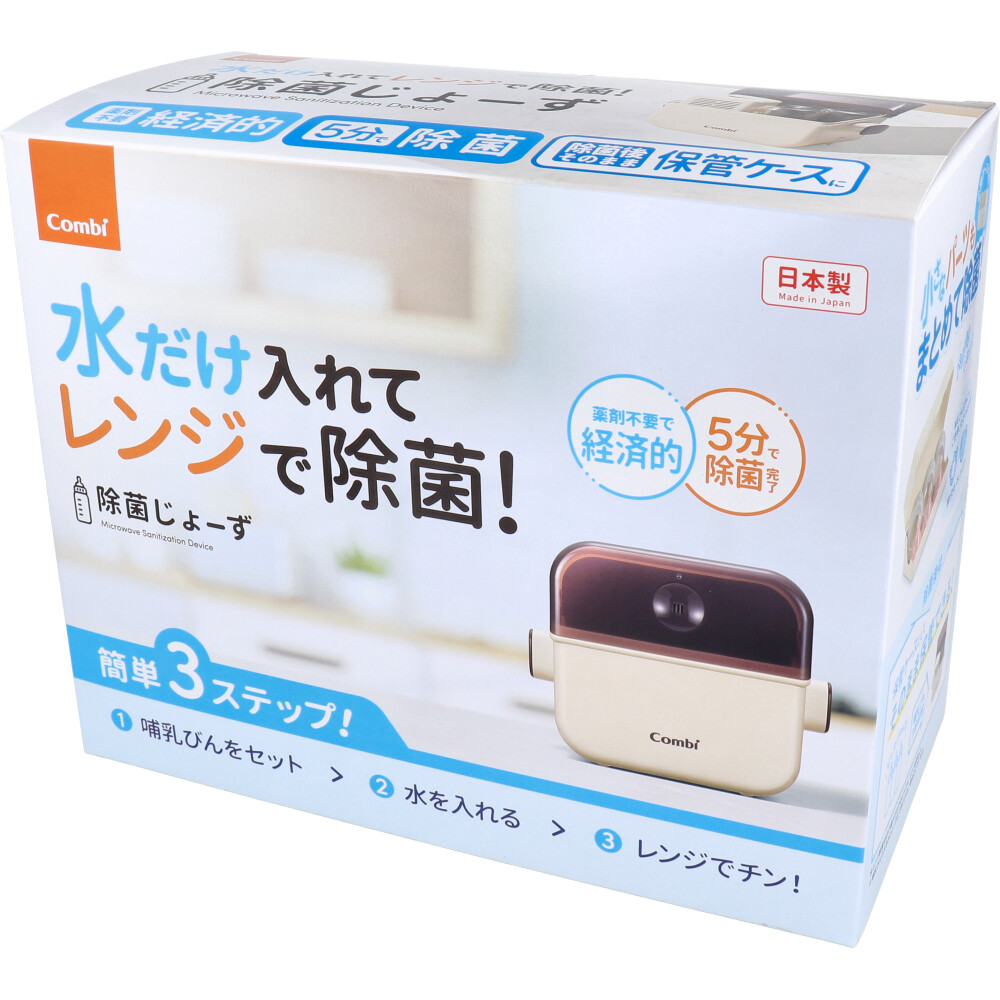 | 商品説明文 簡単3ステップ! 哺乳びんをセット!→水を入れる→レンジでチン! ●5分で簡単、電子レンジ除菌。そのまま保管できます。 ●保管ケースがまるごと除菌できるので衛生的。 ●小さなパーツをまとめて除菌!小物ケース付き! ●哺乳びんが3本まで収納できます。 ※哺乳びんの大きさによっては3本入らない場合がございます。 ※お使いいただく電子レンジの取扱説明書に記載されている内容に従って使用してください。 【材質】 ・本体、トレー、フード、給水カップ、哺乳びんスタンド、小物ケース、フード軸・・・ポリプロピレン(耐熱温度:140度) ・水抜き栓・・・熱可塑性エラストマー(耐熱温度:140度) 【使用できる電子レンジの庫内有効寸法】 ・幅26.5cm以上×奥行26.5cm以上×高さ13.0cm以上 ※電子レンジにより庫内に凸部がある製品がありますのでご注意ください。 【使用方法】 電子レンジ除菌後、そのまま保管ケースとして使用できます。 (1)哺乳びん・乳首をきれいに洗浄して、本体内の所定の位置にセットしてください。 (2)本製品を横に寝かせ、吸水口から給水カップで2杯の水を注いでください。 (3)電子レンジで5分間加熱してください。 ・家庭用電子レンジの出力500〜700Wの範囲で使用してください。 ・必ずレンジ機能のみで使用してください。 (4)冷ました後、電子レンジから取り出し水抜き後、そのまま保管ケースとしてお使いください。 【注意】 ★警告:破損・変形・溶ける発火のおそれあり ・取扱説明書をよくお読みの上、正しくお使いください。 誤った使いかたをすると、ヤケドや電子レンジの破損、 本製品・本製品で除菌するものが破損する 変形する、 溶ける、発火するなどのおそれがあります。 ・付属の給水カップですり切り2杯の水 (60mL) を必ず入れてください。 ・水が少ない状態や、 空の状態では絶対に除菌しないでください。 ・5分を超えて加熱しないでください。 ・家庭用電子レンジの出力 500〜700Wの範囲で使用してください。 ・金属、木、電子レンジ除菌のものを除菌しないでください。 ・レンジ機能以外 (オーブントースター・スチーム・グリルなどのヒーター機能)で除菌しないでください。 ・電子レンジ庫内、 本製品、 除菌するものの汚れ、油分、 洗剤を落としてから除菌してください。 ・除菌中は電子レンジから離れず、レンジ機能になっていること、フードの内側に蒸気による水滴がついていること、 火花が発生していないことを確認してください。 ★その他の取り扱い上の注意 ・火のそばに置かないでください。 ・冷凍庫に入れて使用すると破損するおそれがあります。サイズ・容量、規格 個装サイズ:260X210X130mm 個装重量:約780g 内容量:1個 製造国:日本 |