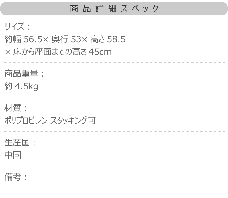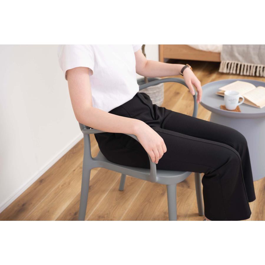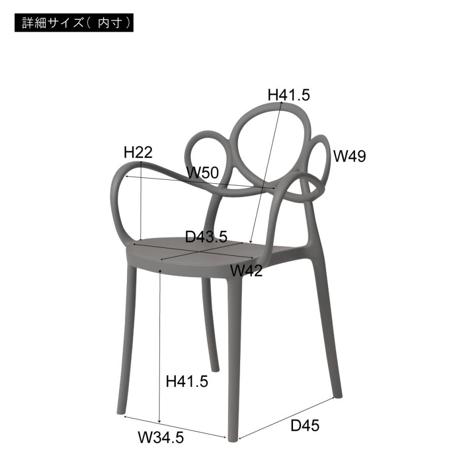 ●背もたれと肘掛けの曲線がスタイリッシュなアームチェア。●シンプルかつユニークなデザインで、ナチュラルやモダン、ミッドセンチュリーなど幅広いテイストのお部屋にぴったり。●スタッキングが可能なので収納もラクラク。●座面の奥行きは約43.5cmと広々とした設計でゆったりとした座り心地。●脚の裏にはゴム製の保護シールが貼り付けられているので床へのダメージを軽減。●アーム部分は緩やかな曲線を描いており、肘や手にぴったりと沿ってくれます。●サラサラとした触り心地のポリプロピレンを使用しているため、汚れたり水分が付いてしまっても簡単にお手入れが可能。●スタッキング可能なのでコンパクトに収納できて場所を取らず片付けも簡単。商品サイズ:幅56.5×奥行53×高さ83.5×座面高45cm材質:ポリプロピレン生産国:中国備考:完成品/スタッキング可"}
