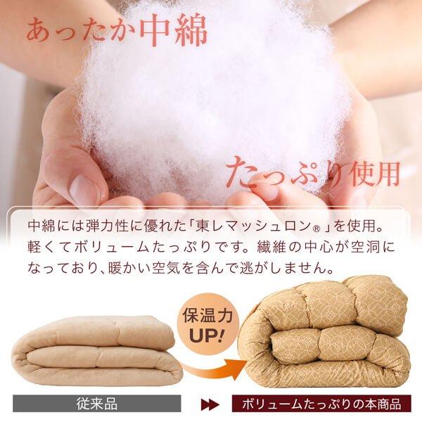 ●パッと華やぐ つばきの花模様つばきの花がお部屋を明るく彩ります。ほっこりなごむ落ち着いた色味とかすれた風合いの柄はどこか懐かしい雰囲気です。●あったか中綿 たっぷり使用中綿には弾力性に優れた「東レマッシュロンR」を使用。軽くてボリュームたっぷりです。繊維の中心が空洞になっており、暖かい空気を含んで逃がしません。保温力UP!従来品→ボリュームたっぷりの本商品"}