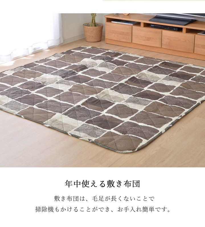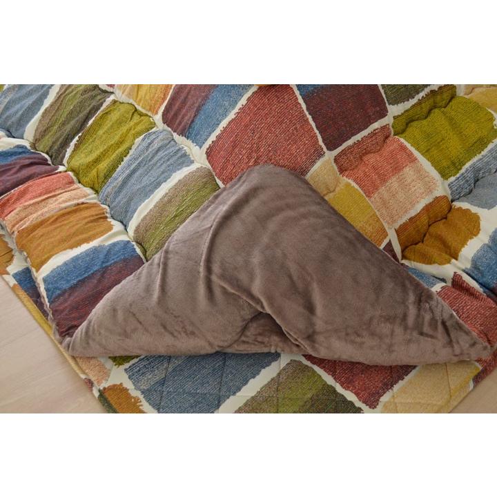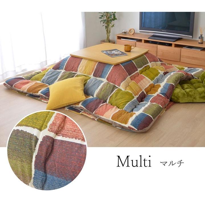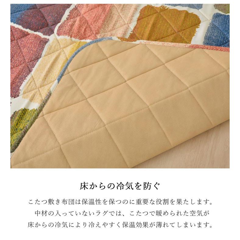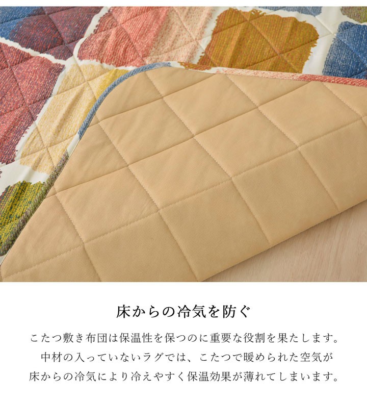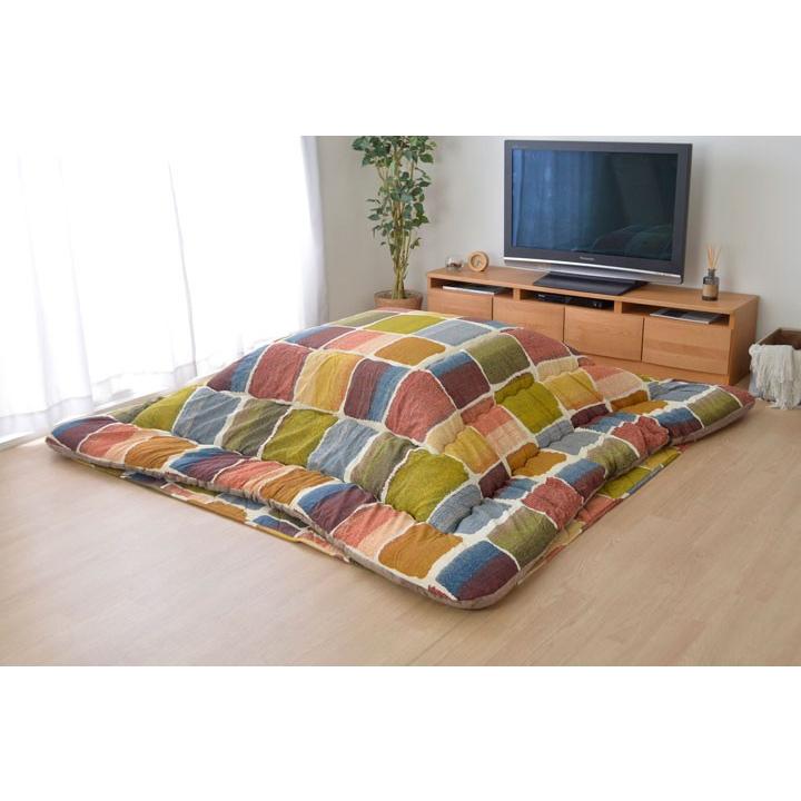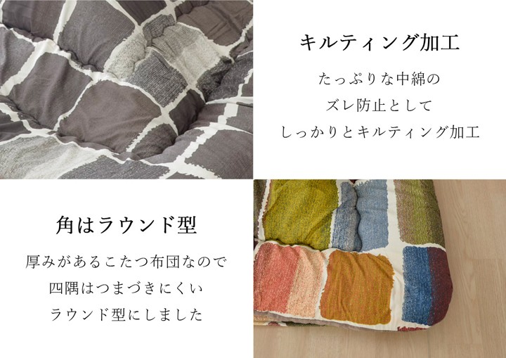 ●サイズ205×245cm●原産国掛け=日本(側=中国 最終加工=日本) 敷き=中国●組成掛け)表地=ポリエステル 100%【ピーチスキン】裏地=ポリエステル 100%【フランネル】中材=ポリエステル100% 2.5kg(東レ マッシュロンわた)敷き)表地=ポリエステル 100% 【ピーチスキン】 裏地=ポリプロピレン 100%【不織布】 中材=ウレタンフォーム 6mm+ポリエステル100%●洗濯表示掛け=40℃以下の水温で弱い手洗いで洗濯してください。(洗濯機は使用できません。) 干し方=日陰のつり干しがよい。敷き=40℃以下の水温で弱い手洗いで洗濯してください。(洗濯機は使用できません。) 干し方=日陰のつり干しがよい。●商品特徴パッチワーク風のデザインをしたこたつ布団と敷き布団のセットです。国内でわた入れをしています。側地にはポリエステル素材を起毛させた柔らかい生地を使用しています。部分暖房のこたつは電気代もおトクです。●適応サイズ80〜90×120cmのこたつ台に適応